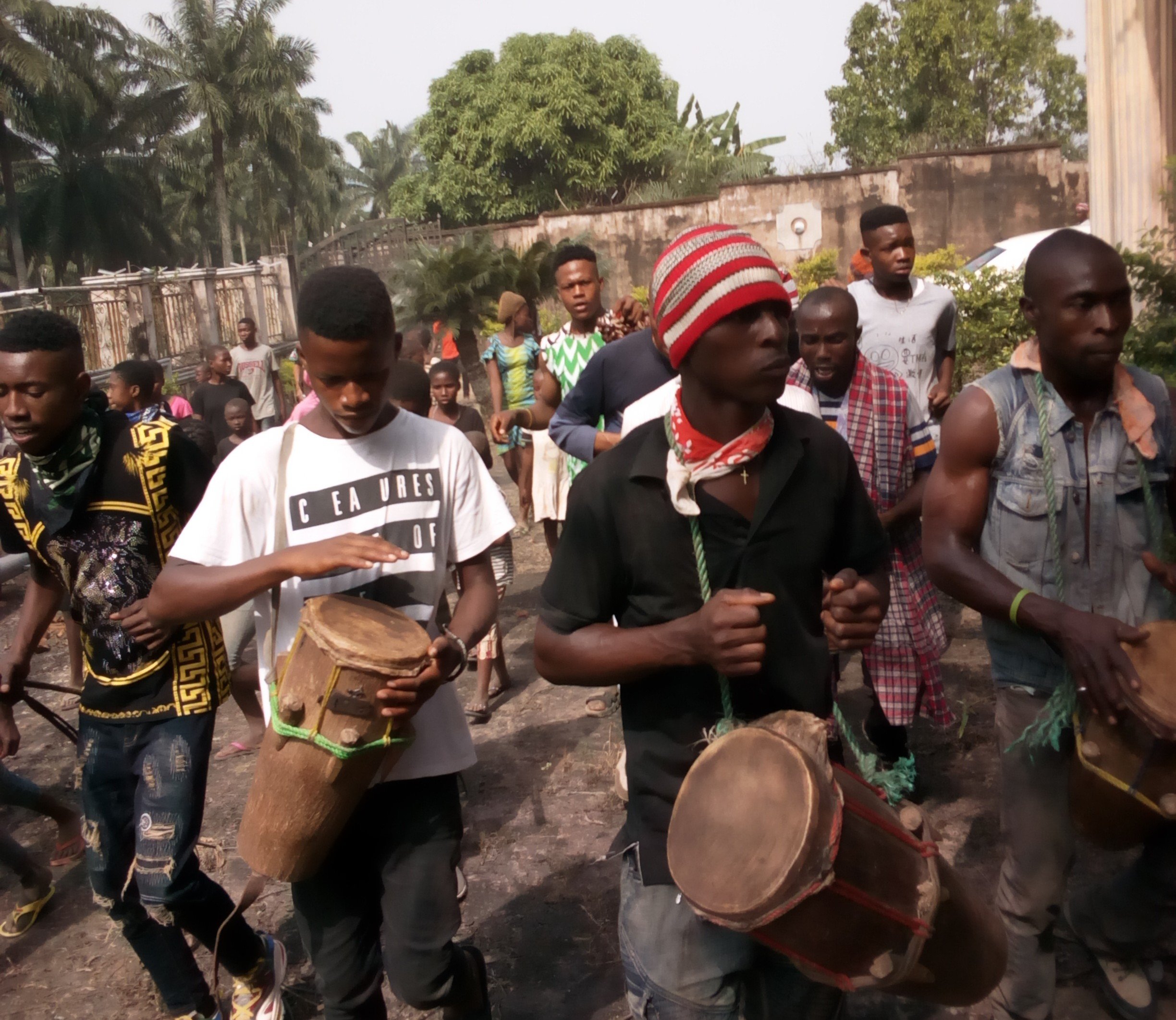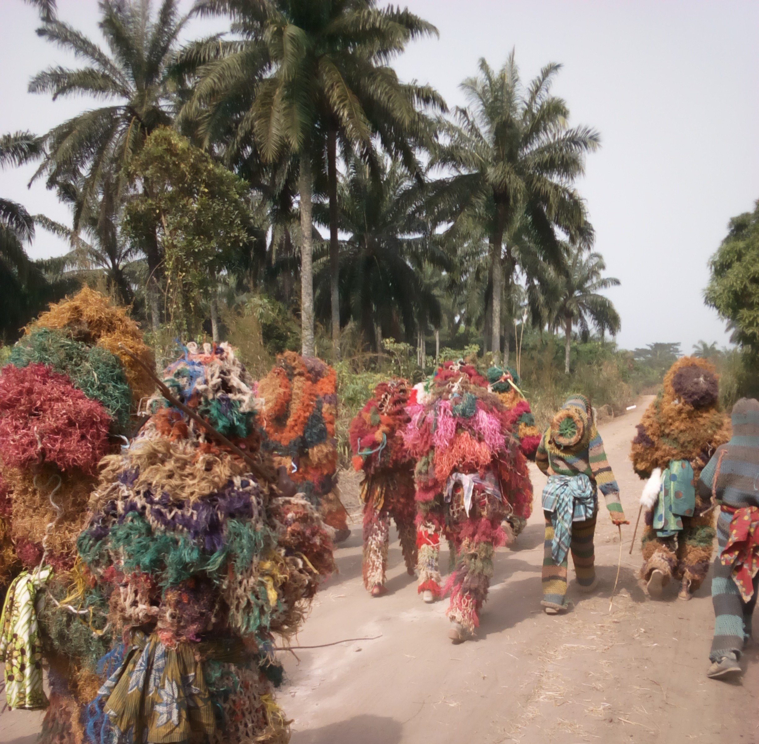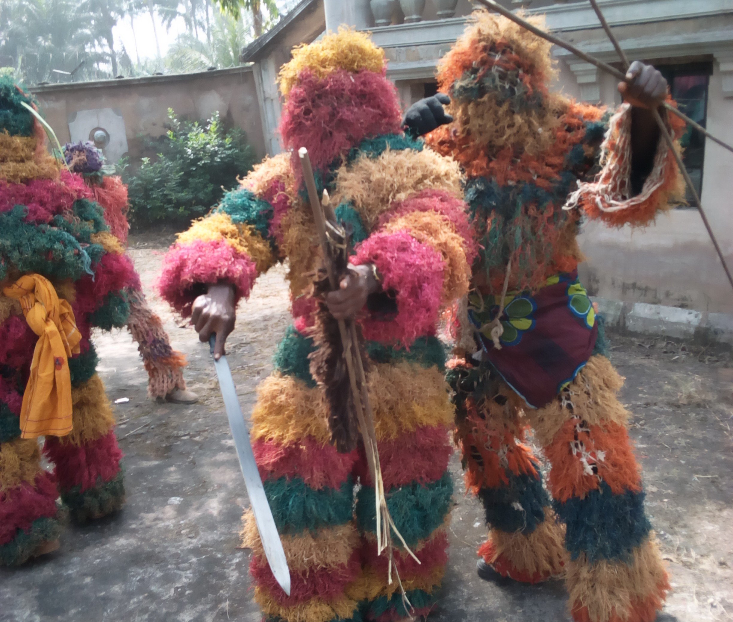 Masquerades gather in each village square with their drummers to dance and entertain people. Afterwards they are offered gifts, food and drinks. They usually don’t speak and are armed with sticks and machetes.